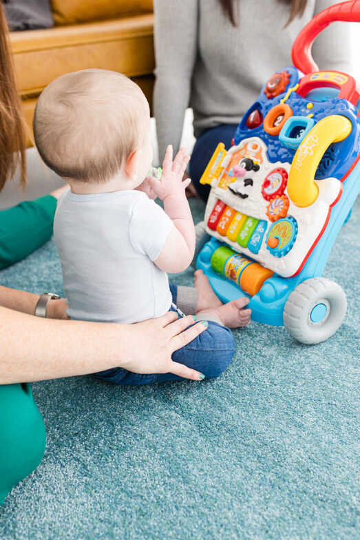 If you want to take it a step further, place that push toy in front of them and watch them reach and hold on to those hips to make things a little easier for them or have them positioned over your leg, hands on one side, knees on the other. This will help them gain necessary strength and coordination for crawling!